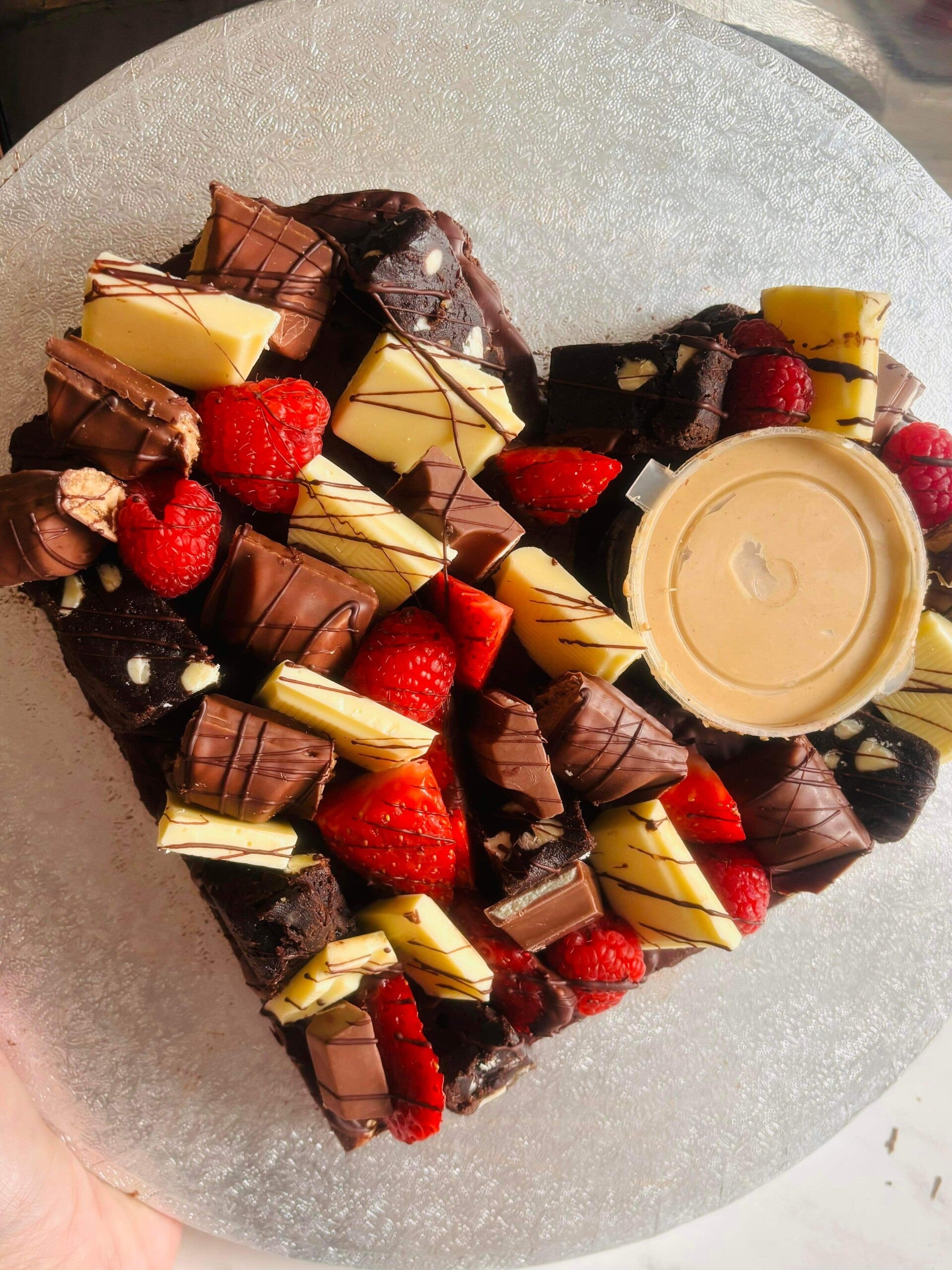 A brownie heart topped with juicy strawberries, sweet grapes, drizzled chocolate, your choice of chocolate bars, and a sauce pot is like a dessert masterpiece! Imagine sinking your teeth into a rich, fudgy brownie heart, complemented by the freshness of strawberries and grapes, all decadently drizzled with chocolate. And the best part? You get to customize it with your favorite chocolate bars and a side of sauce for that extra touch of indulgence. It's a sweet symphony of flavors that will make your taste buds sing with delight!
